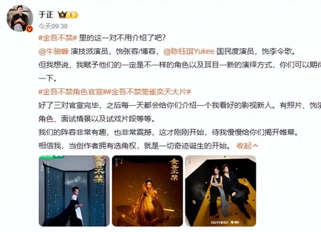 《金吾.不禁》官宣,陈钰琪.出演.女二号.李令.歌。不是大.女主,也不.是番位最.高的,但于正却.为她公开.站台: "演员不.爆火就.是我失败。"