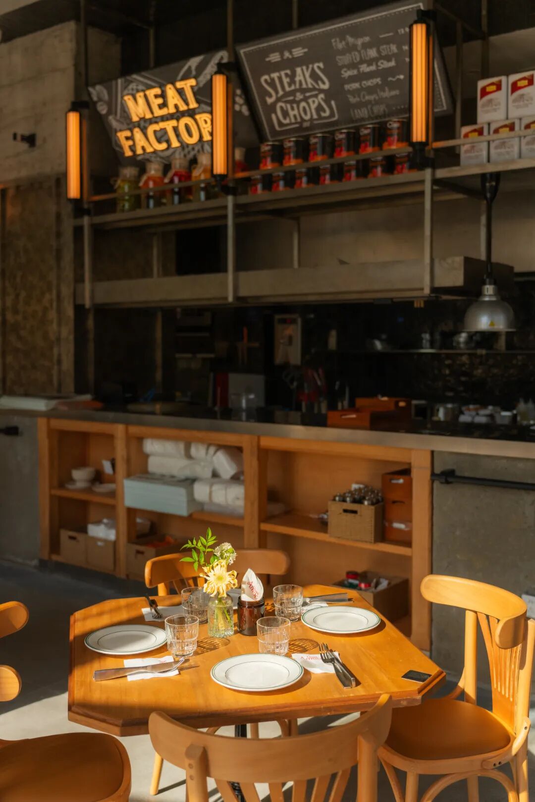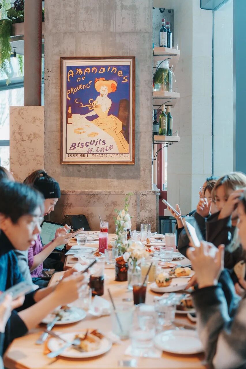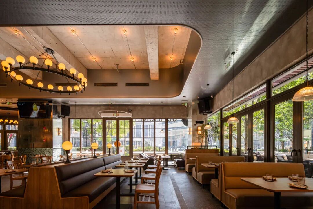整面玻璃幕墙把明亮的光线引入室内,木制桌椅带来独属于上海的小资情调,开放式明档,互动式吧台轻松欢快的氛围一下就拿捏住了。