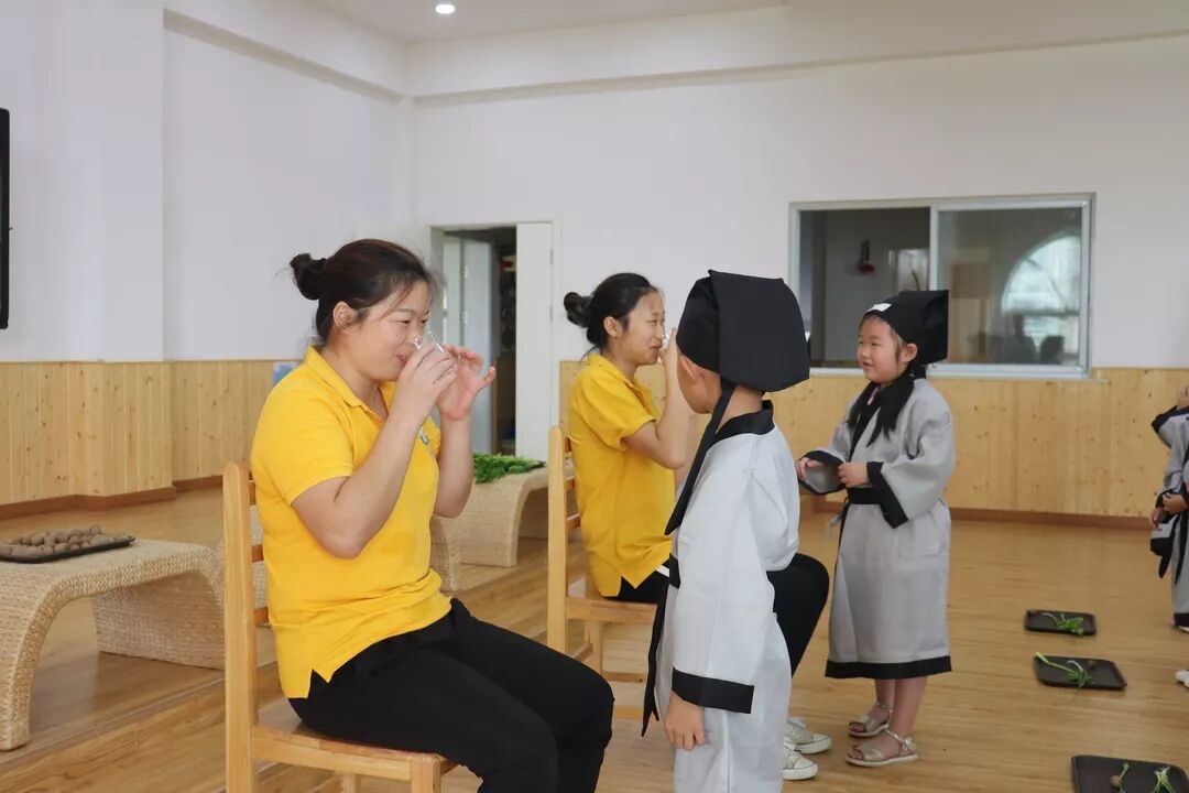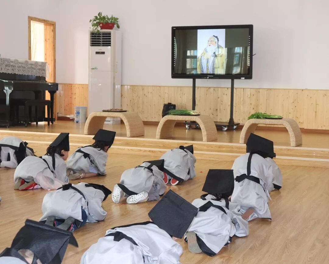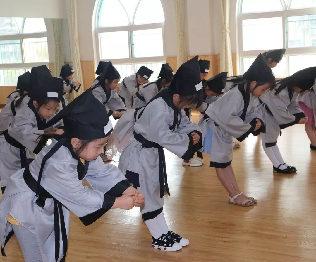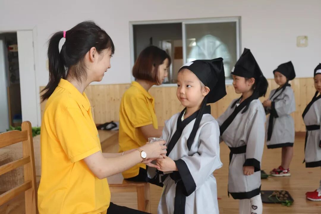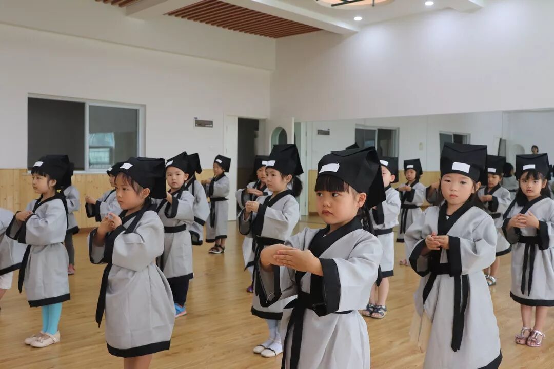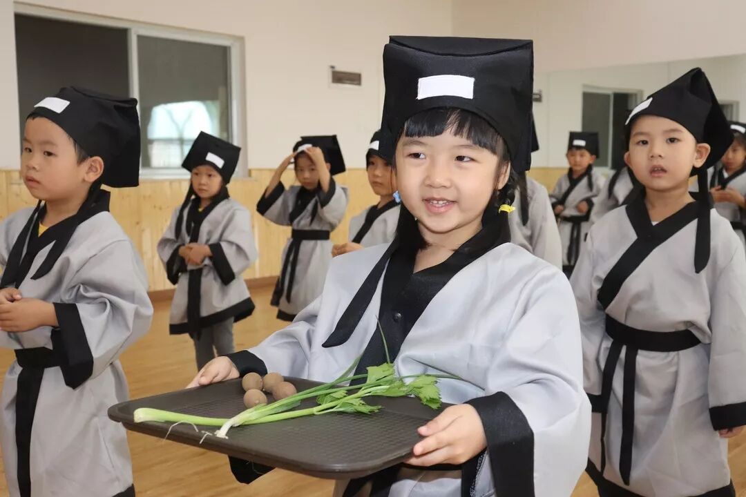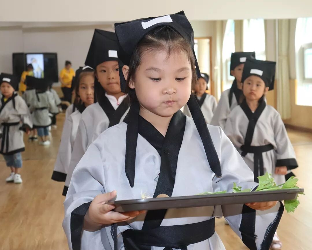 活动中,大班全体幼儿身着汉服,通过“拜至圣先师孔子”、献“六礼束脩”、回礼等环节,重现“拜师礼”,让孩子和老师们一起用心感受传统文化的独特魅力。