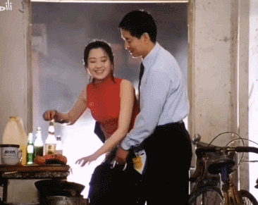 她穿一件紧身红色无袖毛衣,腰上系一围裙,为爱人煮羹食。