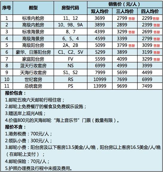 “舱型价格明细”