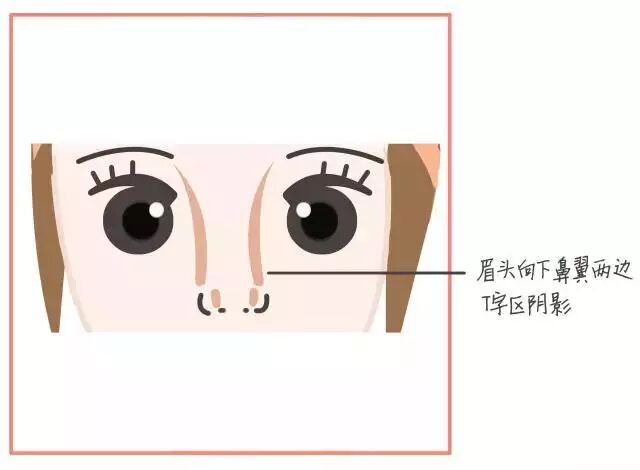 从眉头向下用暗色修容,修饰鼻梁的宽度,使鼻子看起来更挺。鼻翼两边也用暗色修容带过,有缩小鼻头的作用。