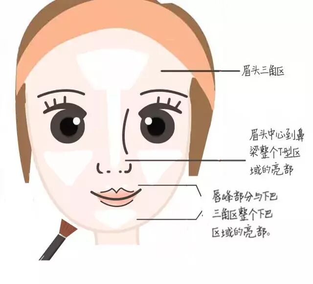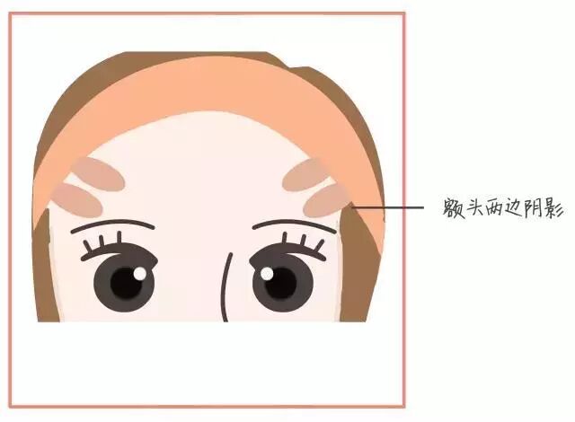 由太阳穴向上画短短的修容线。在额头两边修容,会使其看起来变窄,凸显刚刚打亮的地方,并呈现出光滑明亮的感觉。