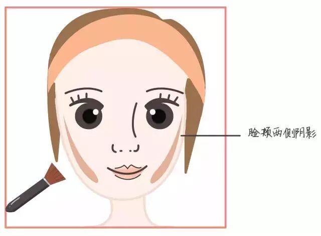 用修容从颧骨往下巴,直接一笔画下来。斜度越高越能呈现消瘦感。涂抹的范围请留意不要太厚。