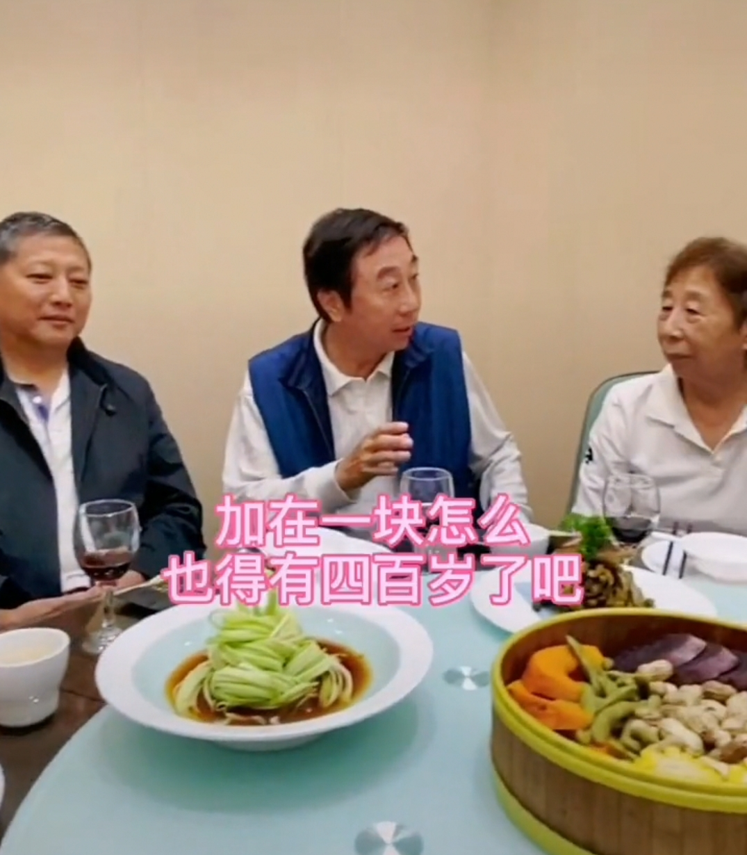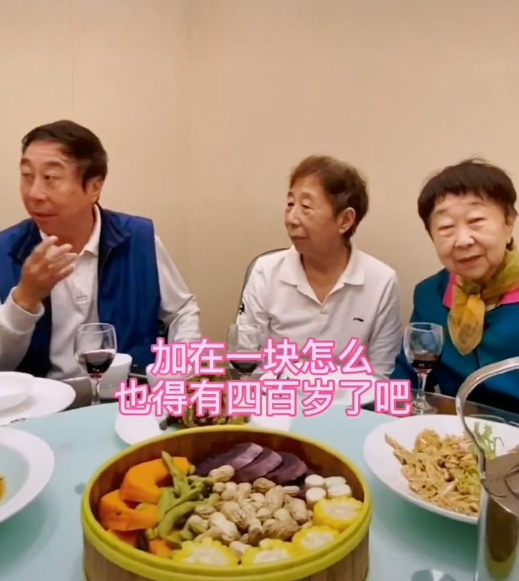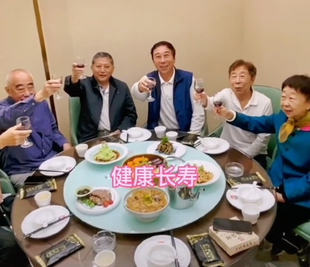 视频最后,围坐一桌的六位老人举起手中的红酒杯,一起对着镜头送祝福,看上去好似许多个冯巩同时出现,令人惊喜。