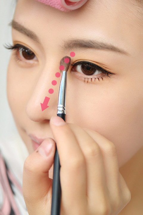 取少量的阴影粉,从眉头起笔,刷在鼻梁两侧。