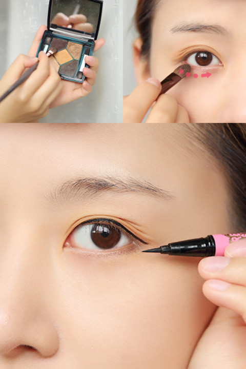 3、取用深棕色眼影由外眼角往内晕染下眼线