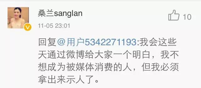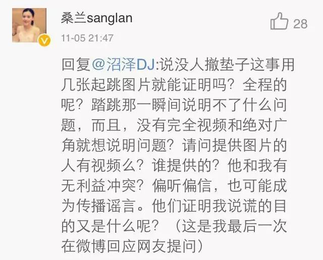 事情发生后,桑兰在11月5日的微博中和网友互动时表达了自己的态度。她认为,是否有人撤垫子这件事用几张起跳图片无法证明。她还在微博中承诺,近期会跟大家把这件事说明白。