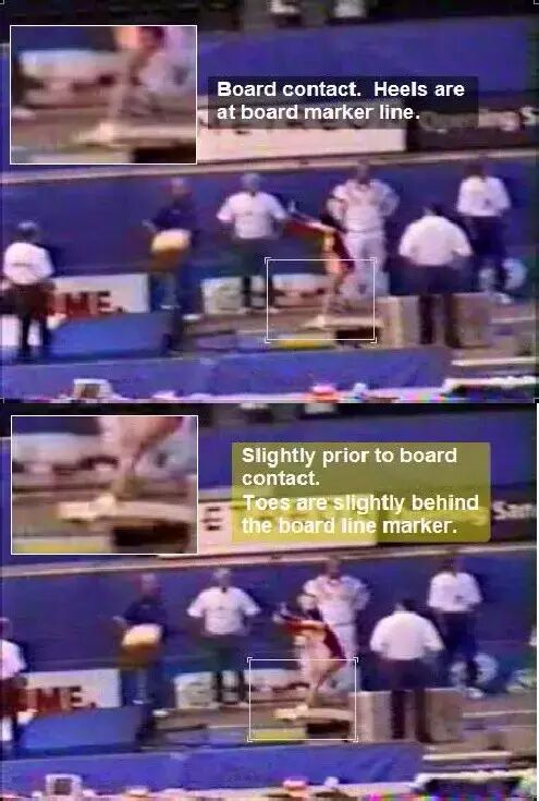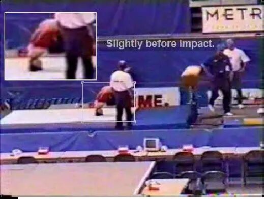那么桑兰多跑了这20厘米,是不是因为受到罗马尼亚教练贝鲁的干扰所致呢?以追究桑兰受伤原因为唯一使命的桑兹教授,压根儿就没提撤垫子的事儿。也许他从来就不知道有一个撤垫子问题的存在。不过,桑兹教授给出的这9帧截图,无意中已经足够洗脱桑兰在第5版起诉书中对贝鲁的指控。