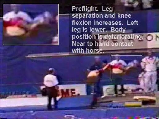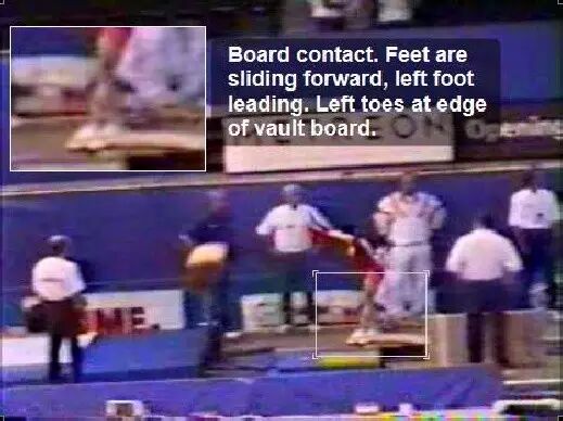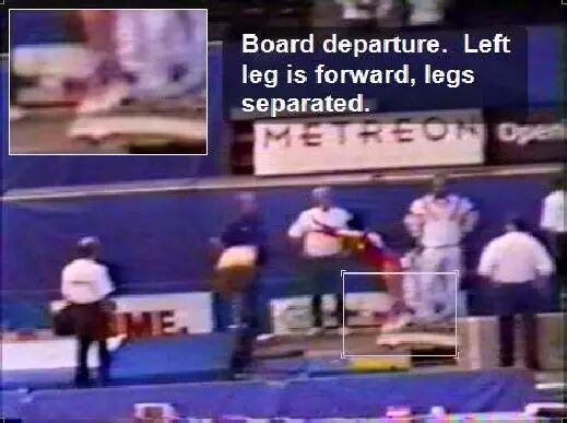 因为有卡特教练附加的限制条件,桑兹教授不能够将这盘录像带完整地拿出来示人。不过,为了说明他的分析判断,他还是配发了9帧截图,内容从桑兰的双脚即将踩上踏板的瞬间开始,到桑兰的头部即将着地的一刻截止。
