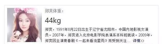 其实说到瘦,除了现在的赵丽颖,相信大家对郑爽妹子也是印响深刻,说到郑爽,“筷子腿”、“整容脸”这些词都离不开她,对于郑爽的体重,粉丝也是表示一万点的心疼,想要变胖对她来说好像是很难的事,看她的体重也是来来回回没超过九十斤!