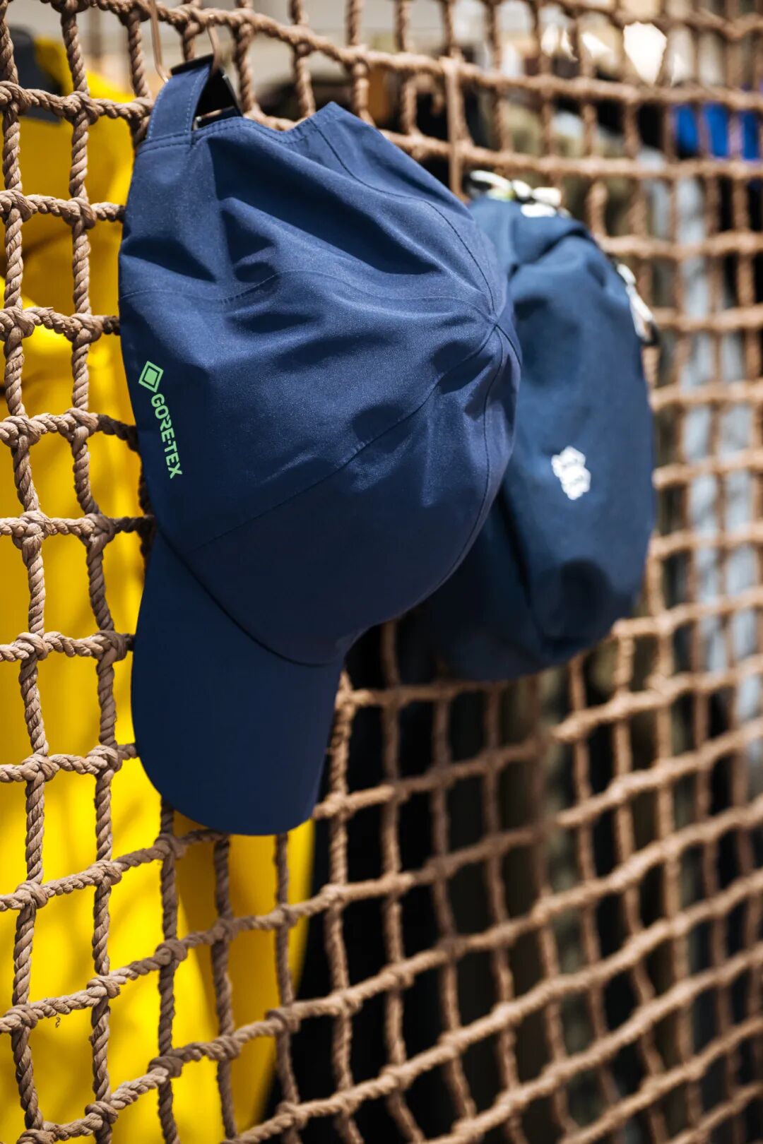 在大片蓝与黑色调之中点缀的极光绿,其应用逻辑不仅是「装饰」。在冲锋衣的风帽下方、Gore-Tex 标,以及棒球帽的侧边,它作为一种「隐性标识」存在。摒弃了将品牌与设计符号外显的常规操作,转而创造一种内化的穿着体验。不仅对应极光与「闪耀」的视觉概念,色彩在此也成为私密的修辞手法,服务于内在的自我确认,而非外部的身份宣告。