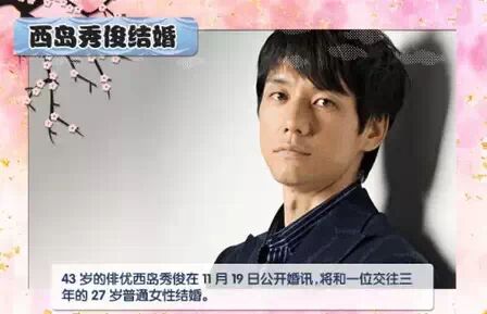 11月19日,43岁的西岛秀俊公开了婚讯,透露自己将和一位交往三年的27岁普通女性结婚。据称两人经由友人介绍而相识,已经交往3年。西岛秀俊称女友“性格开朗温和,一直在身边支持自己”,所以最终决定步入婚姻。另外,因为女方是圈外人士,并未公开其姓名照片等私人信息。
