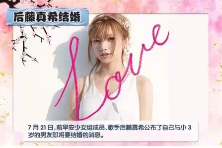 7月21日,后藤真希公布了自己与年下3岁的男友将要结婚的消息。据悉后藤真希和男友是同乡,交往了一段时间后,已见过彼此家长,最终计划将在今年步入婚姻的殿堂。
