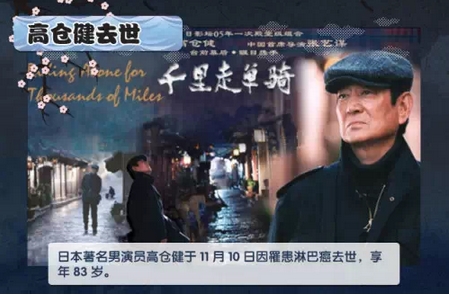 11月10日,日本著名男演员高仓健因罹患淋巴癌去世,享年83岁。高仓健去世的新闻直到18日才由媒体报道,据称是因为本人要求低调举办葬礼,所以家属一直未向外界公布消息。
