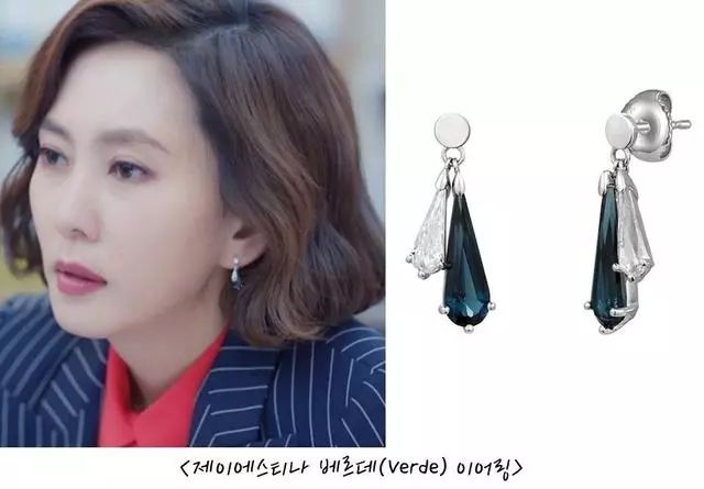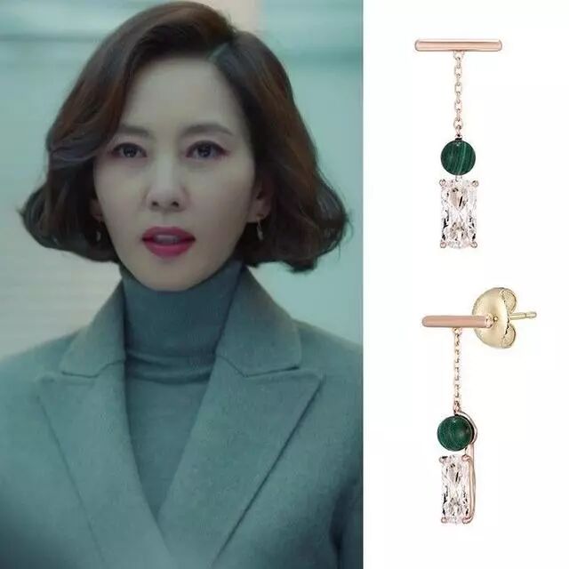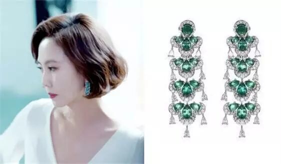 除了之前提到的平价耳饰之外,还出现了一款Chopard的高级珠宝系列耳环,祖母绿色的镶钻耳环配着白色衬衫优雅冷艳。
