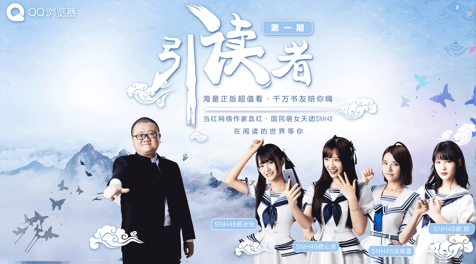 现在SNH48的费沁源、杨冰怡、洪珮云和谢妮,联手作家血红来推介#QQ浏览器引读者#啦,《引读者》热血创刊,第一期上述五位嘉宾以朗读和书单推荐的形式为大家引荐了精品书籍。