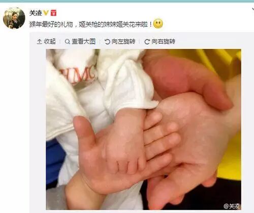 《我爱我家》里的圆圆,关凌,2月18日,关凌通过微博晒出了一家四口牵手的温馨照片,庆祝二胎女儿出生。她留言称:“猴年最好的礼物,姬关枪的妹妹姬关花来啦!”