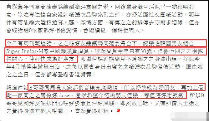 翻译:今天有周刊爆料,之之是在好友钟镇涛和范姜撮合下认识了韩国男子组合SJ—M的中国成员周觅,虽然周觅今年只有30岁,但是他和之之相处得开心,还很快就成了好朋友。报道还说钟镇涛和周觅都对音乐充满热情,再加上他们一家和之之关系很好,当然希望介绍点朋友给她认识,免得她寂寞。