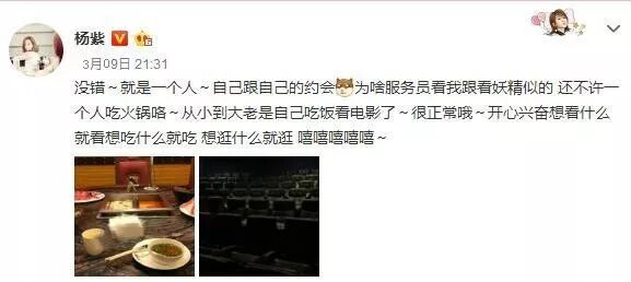 前几日,杨紫发博晒了两张图,一张是独自一人吃火锅,另一张是独自看电影。