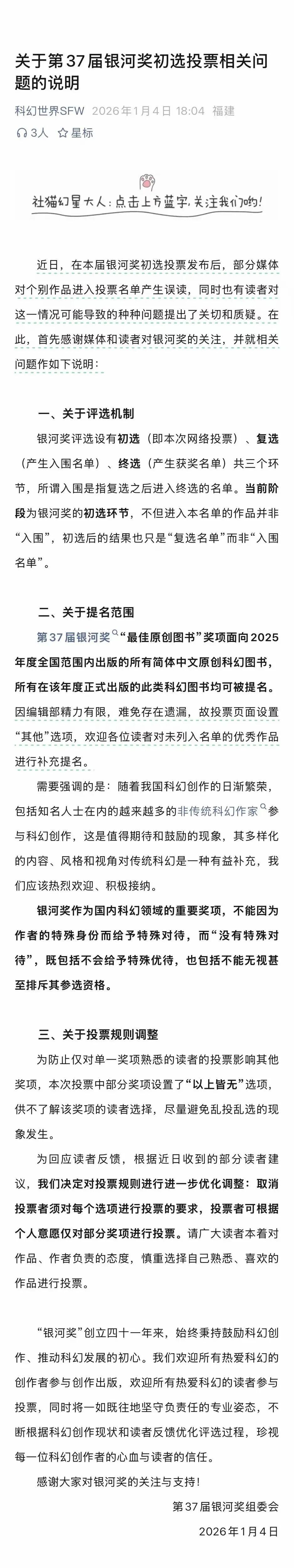 1月5日,科幻世界第37届银河奖组委会发布官方说明,对初选规则、提名范围等核心问题进行了详细澄清。