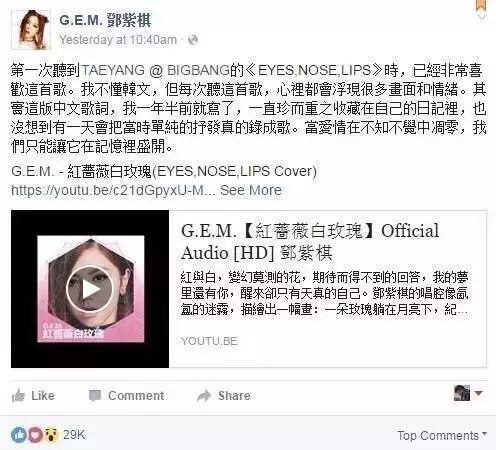 最近,参加综艺节目嘅邓紫棋终于告别皮裤!用才华惊艳观众!用《玫瑰玫瑰我爱你》来作为切入点,无缝融入Bigbang成员太阳嘅热门单曲《眼鼻嘴》,惊艳改编,领到大家耳目一新!