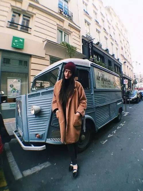 长款的驼色大衣,内搭和鞋子全是黑色,一顶酒红色毛线帽,真是比女生还能驾驭女性打扮。不仔细看还以为是冰冰呢~