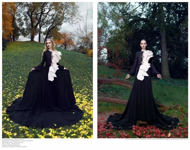 没错,范冰冰这组身穿Marchesa2015春夏系列的水蓝色立体贴花纱裙,头戴花环,宛如“花仙子”般踏花而来的绝美照片,正出自章元一之手。