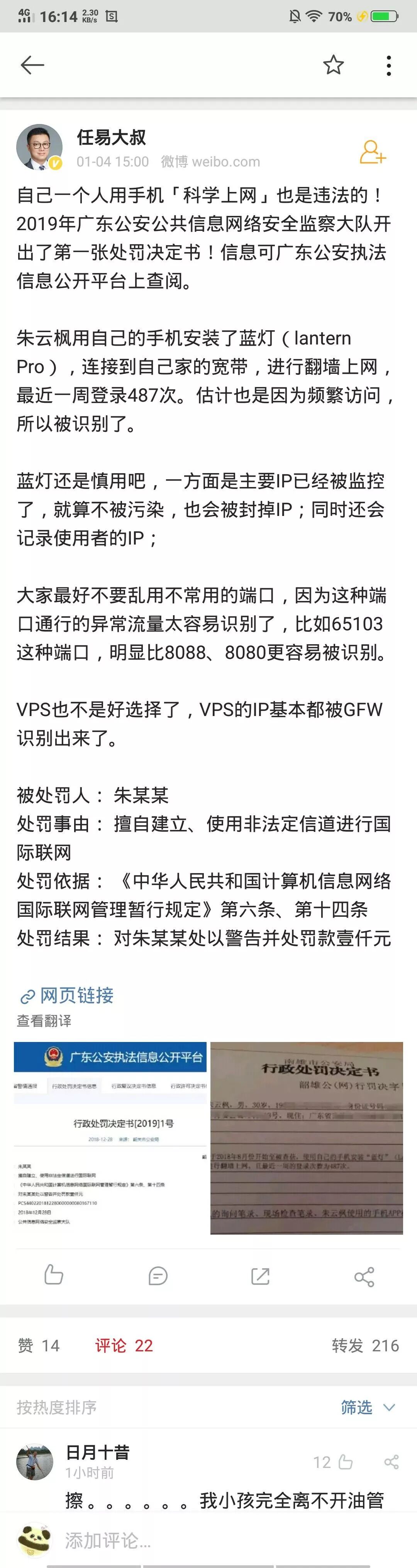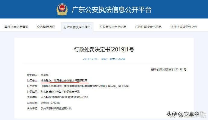 @梦朝思夕 :2019年韶关公安公共信息网络安全监察大队开出处罚决定书,原因是朱某使用手机进行「科学上网」。在过程中,他连接上了自家宽带,或因频繁访问而被识别。最终公安对朱某处以警告,并罚款一千元。