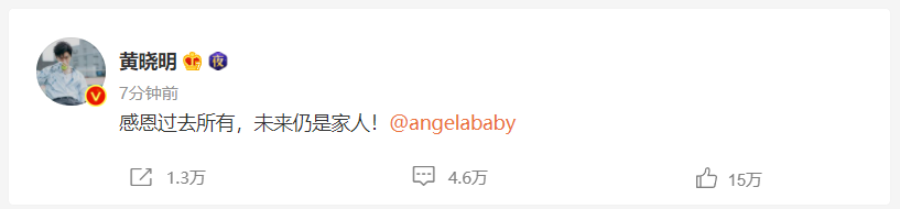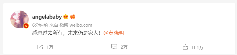 娱乐圈终于有了一个不令人意外的新闻。1月28日13时,黄晓明和Angelababy在微博发布了同样一句话:“感恩过去所有,未来仍是家人”,宣布离婚。