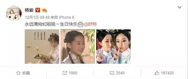 前段时间,杨紫过生日的时候,舒畅也曾发微博祝福“紫妹生日快乐”。