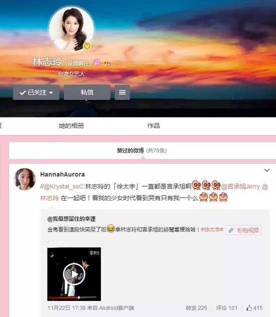 而后有网友上传了该段“借位同框”的视频,并在微博上写到:“林志玲的徐太宇一直都是言承旭啊!言承旭和林志玲,你们在一起吧!”而令人惊讶的是,林志玲本人竟然在该微博下点赞,似有赞同之意。八卦党更激动了有没有。