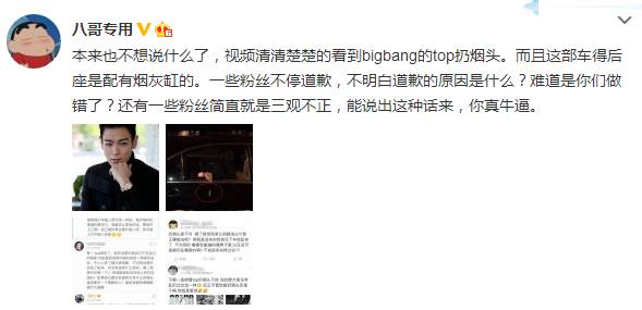 随后“八哥专用”又评论道:“本来也不想说什么了,视频清清楚楚的看到bigbang的top扔烟头。而且这部车得后座是配有烟灰缸的。一些粉丝不停道歉,不明白道歉的原因是什么?难道是你们做错了?还有一些粉丝简直就是三观不正,能说出这种话来,你真牛逼。”