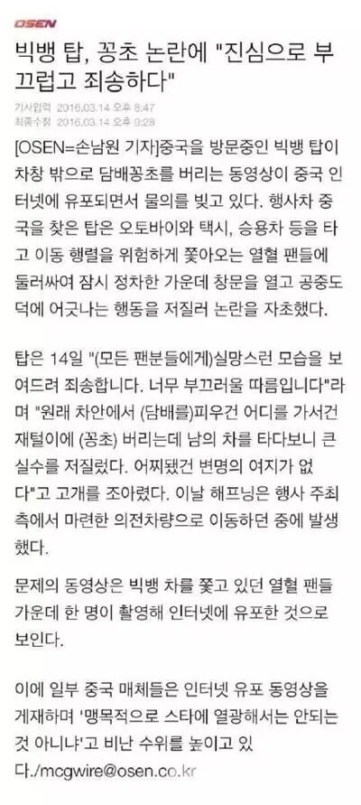 该消息甚至传回韩国, T.O.P在得知此事后,第一时间便道歉表示:让所有粉丝们看见这样让人失望的样子真的感到很抱歉,十分地惭愧。本身不论在哪抽烟都应该把烟蒂扔到烟灰缸,还是在别人的车里,这是很大的失误,不管怎样都没有辩解的余地的。
