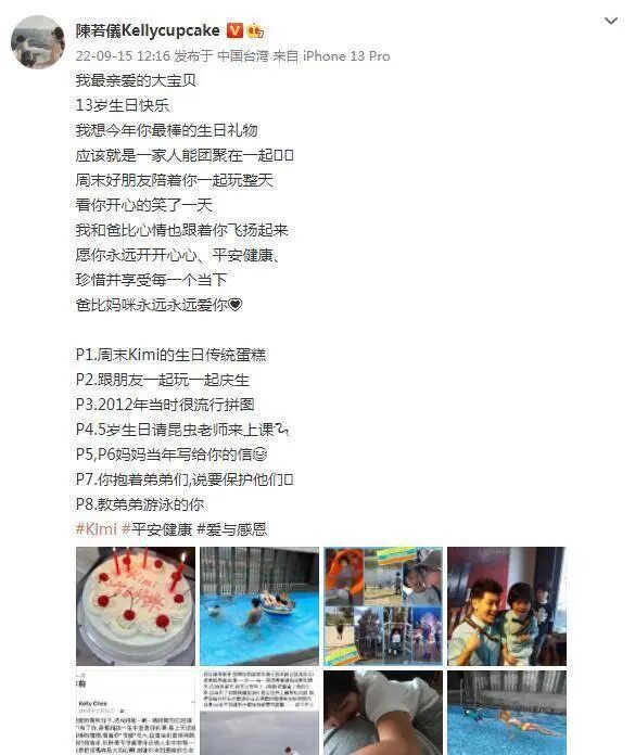 9月15日,林志颖的爱妻陈若仪在个人社交平台发文,为大儿子Kimi庆祝生日。诺诺的小基米已经长成了一个13岁的男孩。时光飞逝。陈若仪写下了对儿子的祝福。她甜蜜地称Kimi为“最亲爱的宝贝”,真是让人心动。