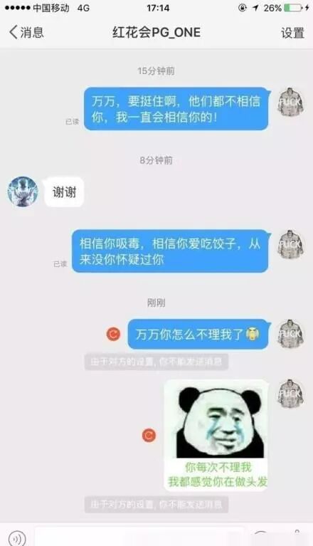 几分钟后PGONE回应:“谢谢。”但网友接着说“相信你吸毒,相信你爱吃饺子,从来没有怀疑过你。”当他再次发消息的时候已被PGONE拉黑了,若不是心里有鬼又为何不敢直言面对。