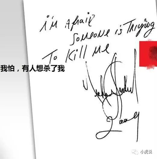 据《每日邮报》5月7日报道,天王迈克尔杰克逊女儿巴黎,声称她的父亲是被人蓄意谋杀致死。天王迈克尔杰克逊的亲笔便笺一共有50张,最近这些杰克逊亲笔便签持有者德国商人雅各布萨根向媒体曝光了5张,天王在其中1张写到:“我担心,有人想杀了我!”。迈克尔·杰克逊预测,他将在2009年死于药物过量,心中充满恐惧的杰克逊于是就给亲友发了求救信。