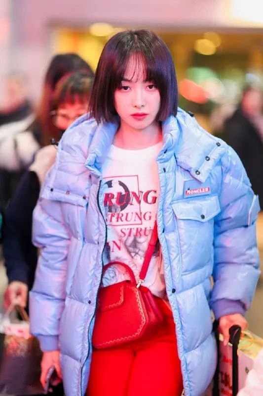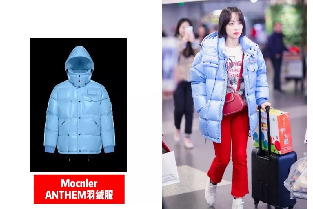 Moncler ANTHEM亮面羽绒服之前8姬有写到过,经典款,上次戚薇在机场也有穿,但戚薇是帅气红黑配,宋茜直接红蓝配了,加上清爽利落的黑色短发,真的是青春大胆。