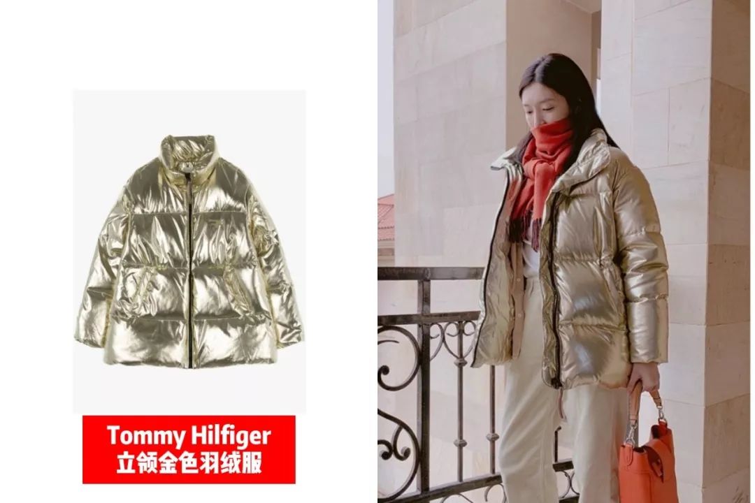Tommy Hifiger 金色亮面羽绒服搭配米色灯芯绒长裤,完全打破了普通羽绒服沉闷、路人的感觉,兼顾保暖与潮流的教科书式穿搭~