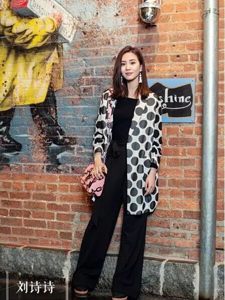 波点的长西服式外套,职业干练,搭配短款上衣和高腰阔腿裤,简约利落,一身正装让刘诗诗穿出一种柔和感~