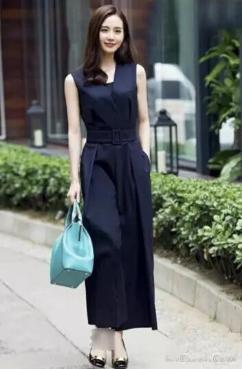 黑色连体阔腿裤时髦优雅,尽显知性时尚的气质,手拎湖蓝色手提包清新怡人。