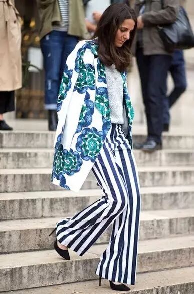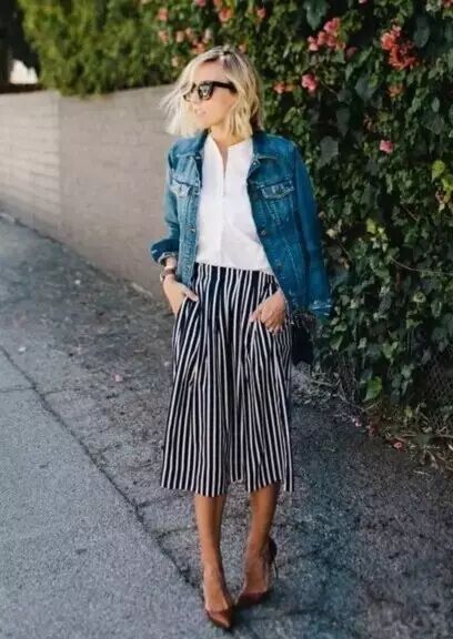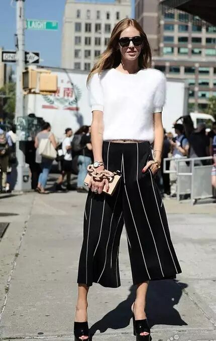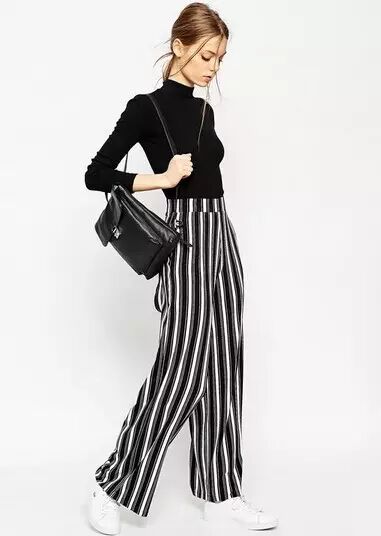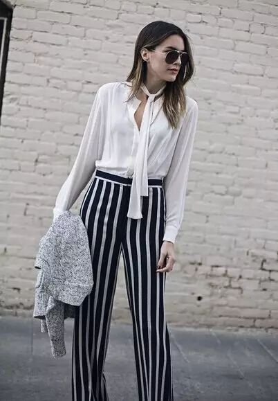 针织上衣搭配阔腿裤,时尚简约,为了凸显品质,最好选纯色的上衣搭配条纹阔腿裤~