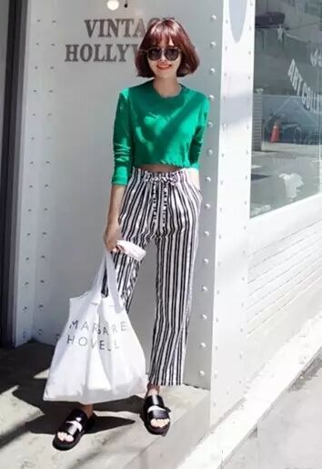 鲜嫩的绿色露脐上衣搭配黑白竖条纹阔腿裤,裤子还是高腰裁剪,上短下长的穿衣法则,会让你看起来更加高挑,绝对适合矮个女生的一身完美搭配