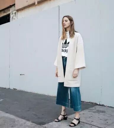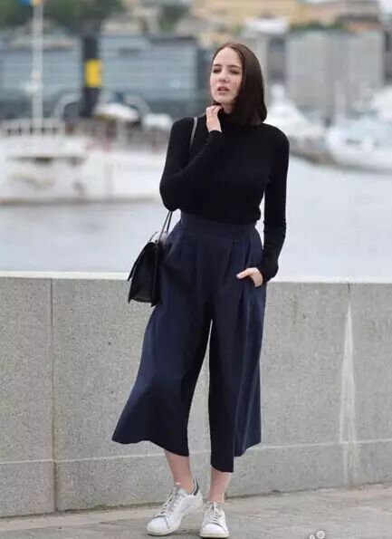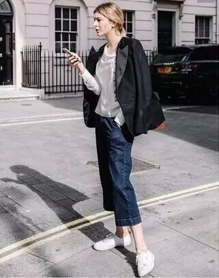 当然你也可以搭配一件针织上衣,用阔腿裤搭配小白鞋,简约休闲!