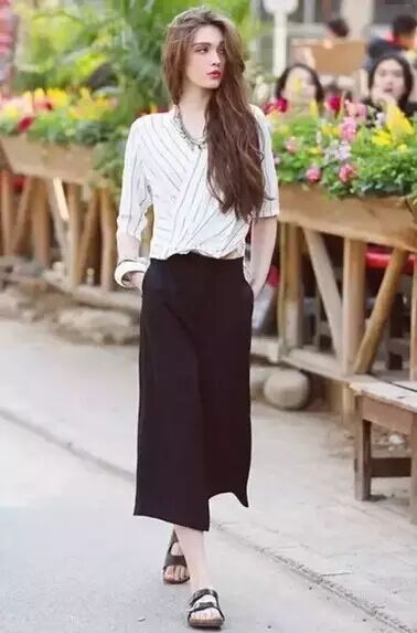 条纹衬衫搭配黑色的阔腿裤,简单易搭~