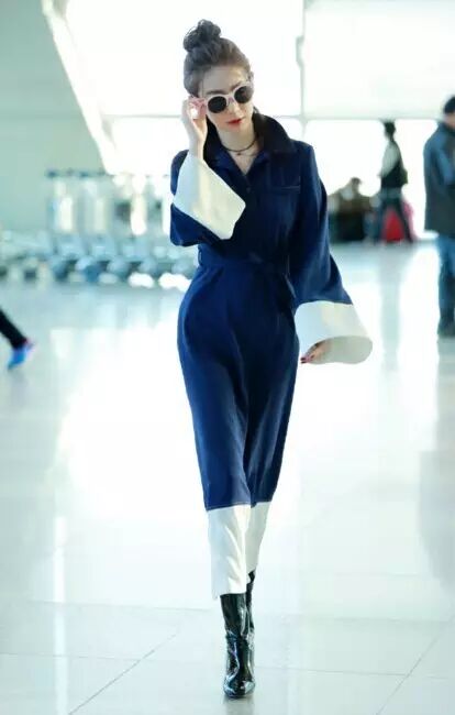 拼接色的连体阔腿裤,透露着时尚感,腰带的设计能够凸显腰部曲线~,戚薇这身真是大写的帅气~