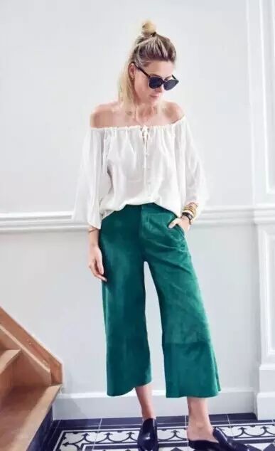 一字肩上衣搭配绿色的阔腿裤,个性时尚~