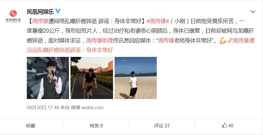 但就在最近,这位低调的情歌教父却被爆出因肝癌离世,面对媒体的关注和求证,周传雄助理方面立即做出回应:纯属子虚乌有,周传雄老师的身体非常好。
