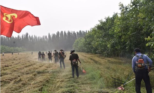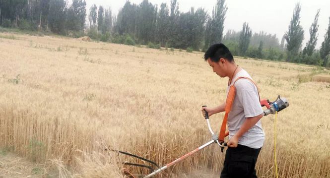 洛浦县多鲁乡塘玛合尼村村民托合提尼萨·玛合木提家的麦地里,由驻村工作队、村干部组成的志愿者服务队正热火朝天的忙碌着。他们头戴草帽、肩扛割麦机、从右向左有节奏的挥舞着机器。一路过去,一把把麦子整整齐齐的躺在地上,豆大的汗珠不断在他们的脸上划过。轰鸣的机器声和农民的欢笑声交织在一起,构成一幅幅优美和谐的画面。