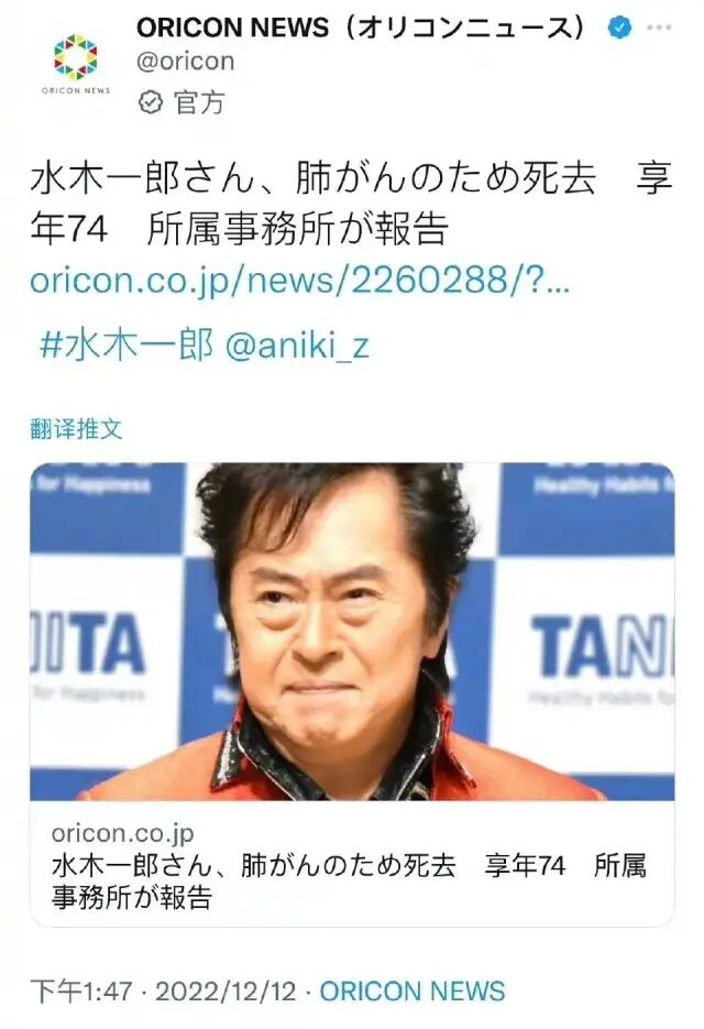 日本知名动画歌手水木一郎去世,曾演唱《假面骑士》系列、《奥特曼》系列等作品主题曲 假面骑士游戏 日韩男星 2022-12-12 20:10:38 433 创作不易,用心坚持,欢迎请BaGua喝几杯爱心咖啡!打赏并支持本文 打赏并删除本文 12月12日,日媒报道被称为”动画歌王“的歌手水木一郎在长达一年半的时间里,多次与癌症斗争,但很不幸,在12月6日送医抢救之后离世。享年74岁。其亲友透露水木一郎的肺癌从发现到离世的时间非常短,而且癌细胞在他体内的转移非常快。水木一郎所属事务所于12日在官方网站发表讣告,称水木一郎在2021年4月末发现罹患癌症之后反复住院出院、并尝试了放射与药物治疗,与病魔抗争了1年7个月,最终在12月6日在医院去世。虽然病情已多处扩散不容乐观,但他始终以持续活动为目标,努力进行康复与治疗,在11月27日最后的Live上还笑容满面。从开始的脑部再到淋巴,再到后续的双腿,短短半年的时间就已经发展到了全身。不过水木一郎一生都是歌手,为了歌唱事业积极努力接受治疗,同时一边治疗一边坚持自己的音乐活动。上个月他出现在活动现场,当时在台上献唱的他状态不错,而且整个人的精气神非常好。但再一次听闻他的消息却是离世的消息,令人悲痛万分。关于守夜和葬礼的活动,根据遗属的意向,仅由近亲举行。水木先生,于1968年出道。1971年为石森章太郎的《小泰山》演唱了他的第一首动画歌曲,延长了若干首动画及特摄歌曲,包括魔神Z、巴别二世、大魔神、宇宙骑士、钢铁基克、超电磁机器人孔巴特拉V、宇宙海盗哈洛克、百兽王五狮子、电子神童、变形金刚Z、假面骑士、奥特曼、高达、鲁邦三世,金属英雄及超级战队系列等等,他所主唱的歌曲已超过了1000首,成为「动画歌之帝王」的称号。这个对于特摄粉、机战粉丝来说,绝对不陌生。点亮“在看”,分享给更多人! 创作不易,用心坚持,欢迎请BaGua喝几杯爱心咖啡!打赏并支持本文 打赏并删除本文 感谢您的支持鼓励,我会继续努力的!文章地址:用户邮箱:打赏金额:USDT 请输入数字点击”去打赏“,即可进行打赏支持本文章哦 水木一郎 发表评论